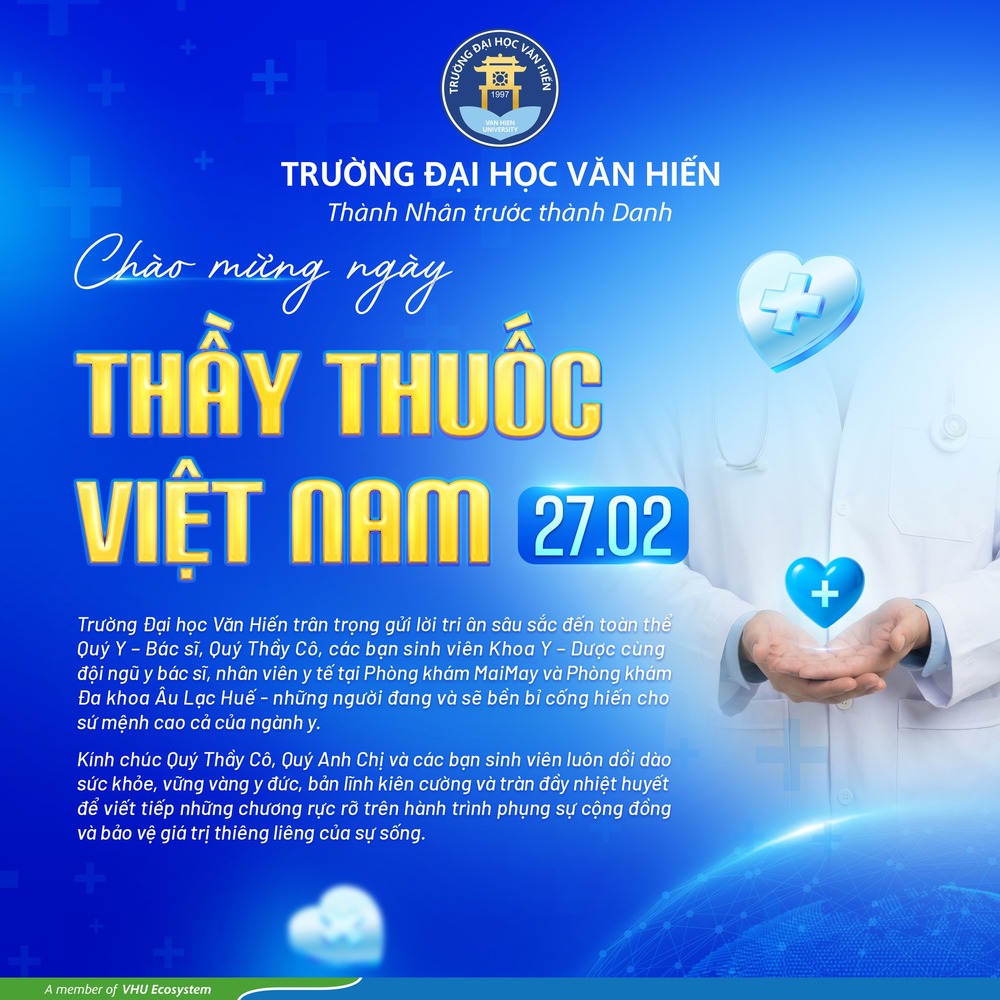 Nhân kỷ niệm 71 năm Ngày Thầy thuốc Việt Nam, Trường Đại học Văn Hiến trân trọng gửi lời tri ân sâu sắc đến những "chiến sĩ áo trắng" đã luôn cống hiến thầm lặng vì sức khỏe cộng đồng. Kính chúc toàn thể Quý y bác sĩ, cán bộ, nhân viên y tế trên cả nước luôn dồi dào sức khỏe, bình an và giữ trọn ngời sáng y đức.