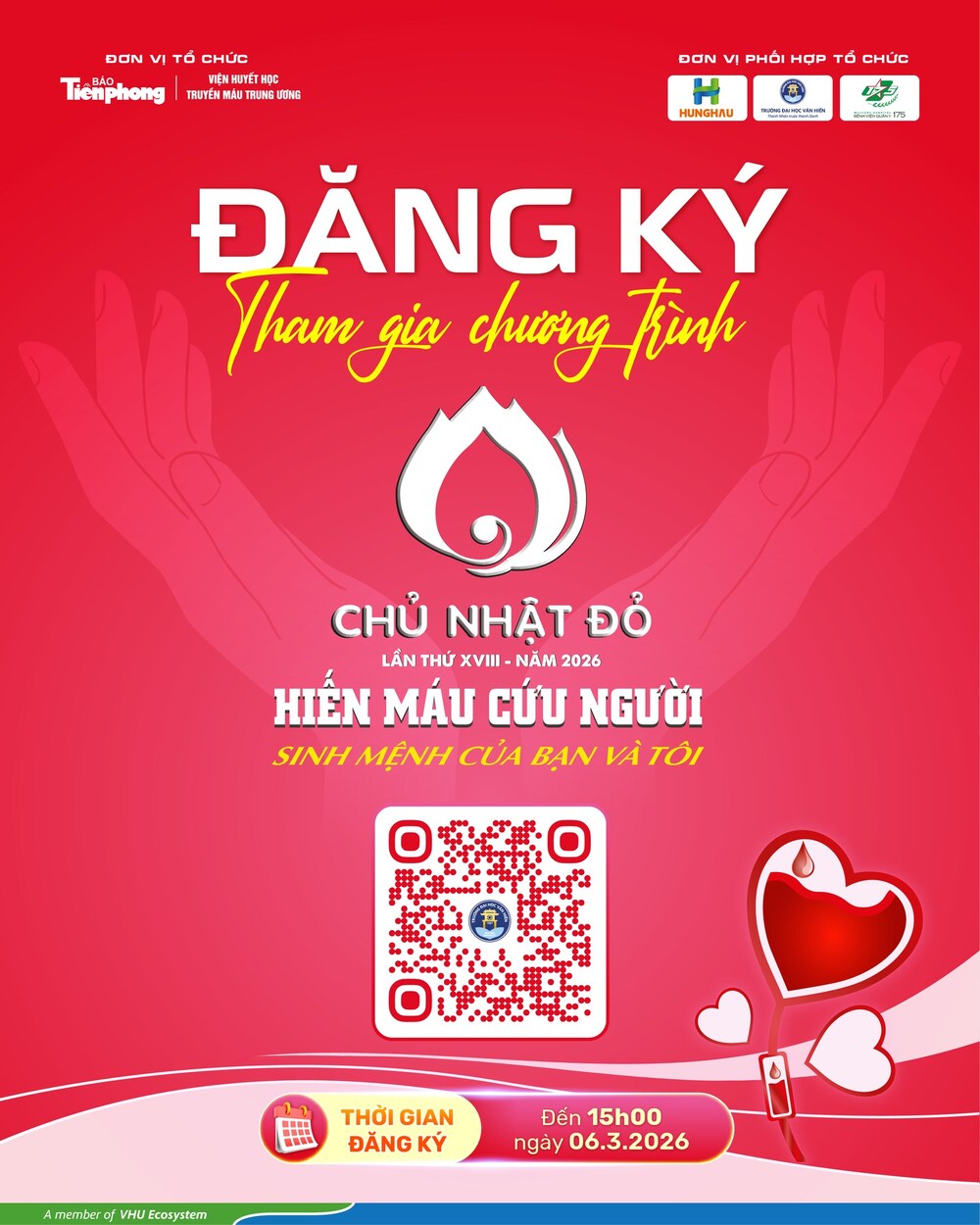 VHUers ơi, hãy cùng đăng ký tham gia chương trình “Chủ nhật Đỏ 2026” để nghĩa cử cao đẹp ấy được lan tỏa mạnh mẽ hơn nữa trong cộng đồng, bởi mỗi giọt máu cho đi, một cuộc đời ở lại.